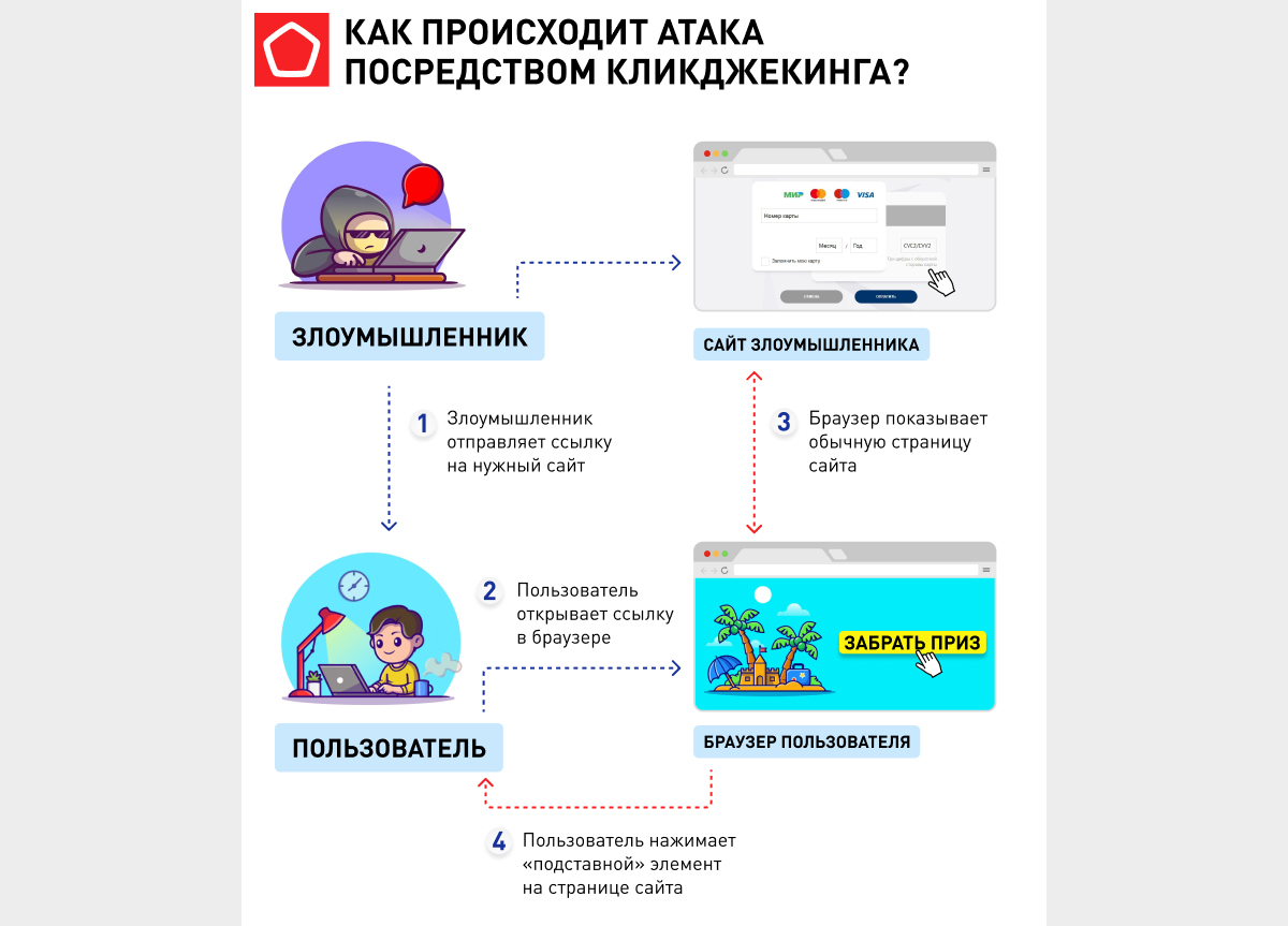 Руководитель направления информационной безопасности центра цифровой экспертизы Роскачества Сергей Кузьменко рассказал, что технически кликджекинг выполняется путем отображения невидимого HTML-элемента поверх страницы, которую видит пользователь. Невидимая страница может быть вредоносной или неблагонадежной. Представьте, что под кнопкой «Получить подарок» может прятаться, например, согласие на платную подписку или разовый денежный перевод.