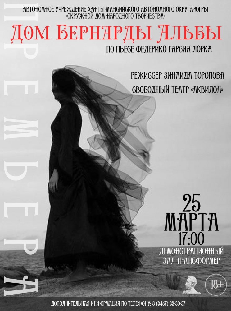 Свободный театр «Аквилон» представит премьерный драматический спектакль по пьесе Федерико Гарсиа Лорки «Дом Бернарды Альбы» на сцене окружного Дома народного творчества.