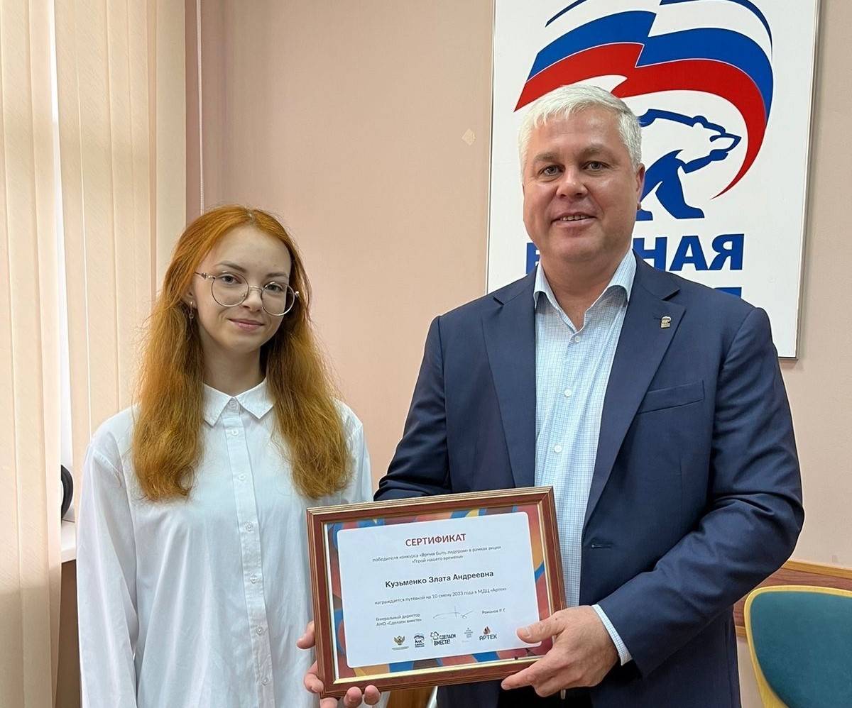 Сертификат в детский лагерь «Артек» победительнице из Нефтеюганска вручил секретарь местного отделения «Единой России» Марат Миннигулов.