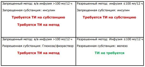 В таблице приведены примеры необходимости запроса на ТИ в случаях использования запрещенных и разрешенных субстанций инфузионно.