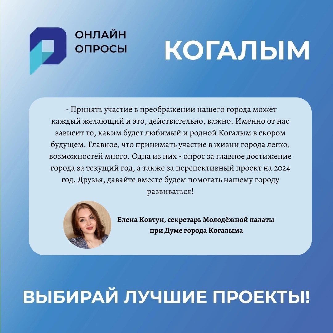 Продолжается голосование за главное достижение города за текущий год, а также за перспективный проект на 2024 год. О том, почему важно принимать участие в голосовании рассказывает Елена Ковтун , секретарь Молодежной палаты при Думе города Когалыма