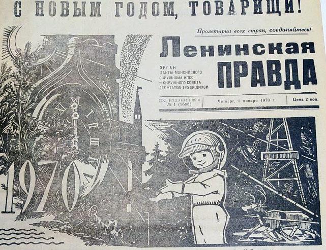 И снова 1 января вышел в свет первый номер «Ленинской правды» в 1970 году. Новогодняя иллюстрация уже занимала не маленький правый уголок, а чуть меньше полполосы: кремлевские куранты, ель, маленький космонавт, тянущий руки к лучам солнца, и нефтяная вышка, у подножия которой бежит северный олень.