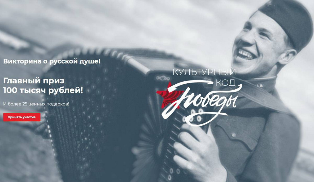 Также до полуночи жители региона могут разгадать «Культурный код Победы». Для этого необходимо ответить на вопросы историко-патриотической викторины на сайте гармония86.рф. Один из них, например, повествует о помощи югорских артистов участникам Великой Отечественной войны. Так, благодаря знаниям в области истории, культуры и искусства участники смогут выиграть один из более чем 20 призов или 100 тысяч рублей. Победители будут определены генератором случайных чисел. Идентификатором послужит номер телефона.