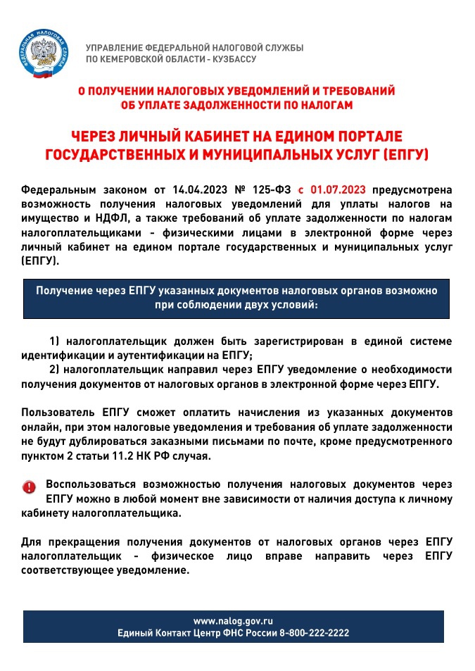 О получении налоговых уведомлений и требований об уплате задолженности по налогам через личный кабинет на едином портале государственных и муниципальных услуг (ЕПГУ)