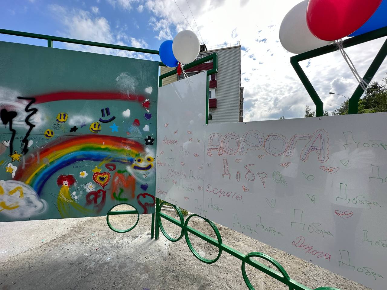 Площадку уже опробовали на открытии и мастер-классе «граффити» дети близлежащих домов, поэтому белые стены с моющимся покрытием уже украшены яркими рисунками и подписями.