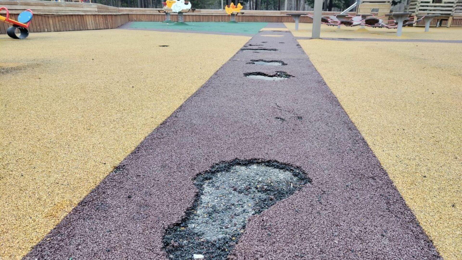 Фото: Ефросинья РамазановаНа предоставленных кадрах видно, что на мягком резиновом покрытии появились «проплешины», краска с бордюров и скамеек сошла, а деревянный настил погнулся и сейчас там, согласно табличке, проводятся ремонтные работы.