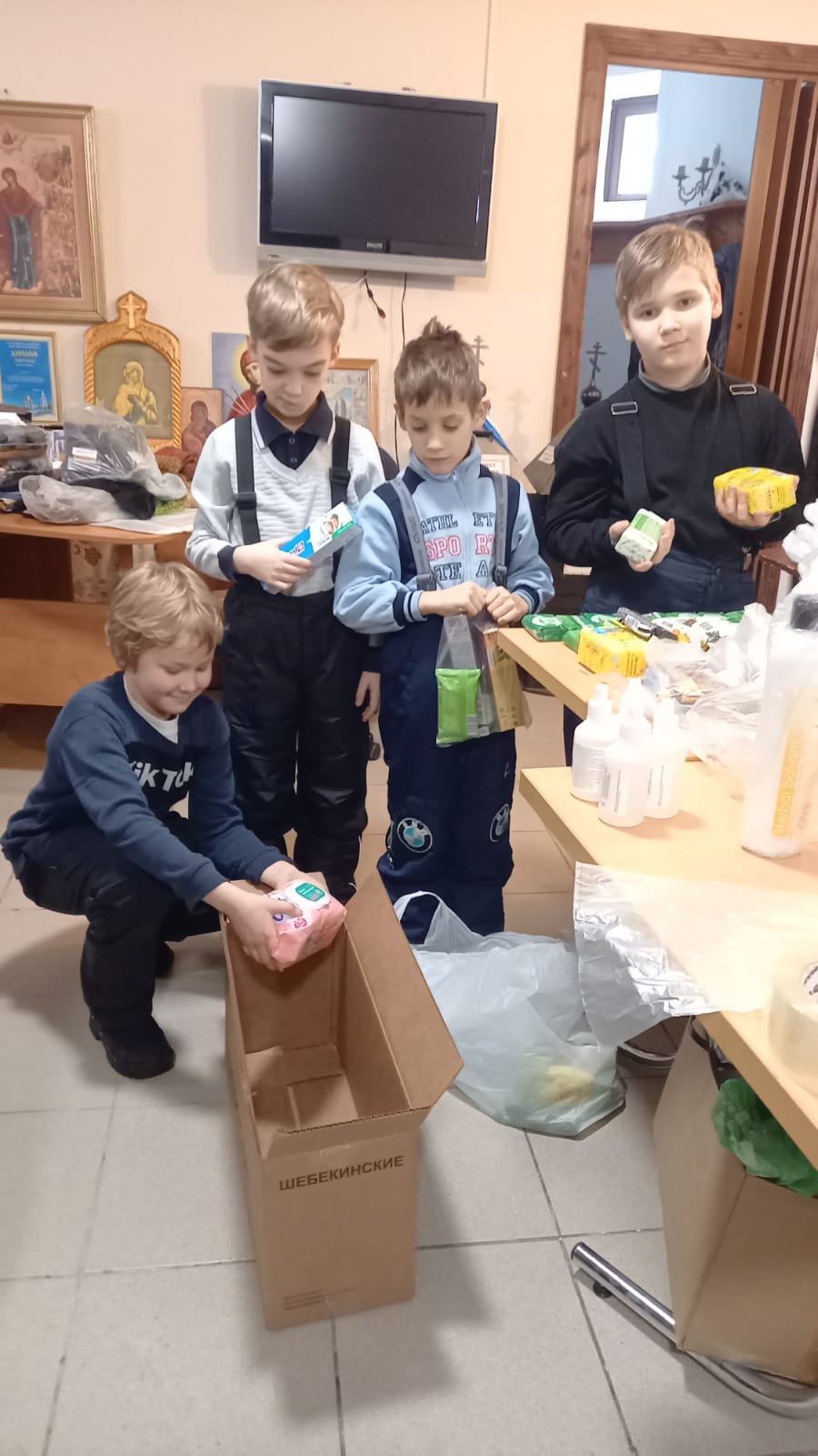 По благословению настоятеля прихода храма в честь иконы Божией Матери «Всех скорбящих Радость» протоиерея Николая Силина в преддверии Дня Защитника Отечества с 26 января по 10 февраля 2023 года на Приходе прошла акция «Пока мы едины, мы непобедимы!». Приход организовал сбор продуктов, лекарств, средств личной гигиены, белья, отдельных элементов обмундирования (наколенники, налокотники) для формирования посылок, адресно направленных воинам-югорчанам в зону СВО. В посылки вложены поздравления с Днем Защитника Отечества, от детей Воскресной школы – открытки со словами поздравлений и благодарности. К акции присоединились: МБОУ СОШ №12 – передала 6 посылок, МБОУ СОШ №15 передала поздравительные открытки. Всего сформировано 20 посылок на 40 человек (одна посылка рассчитана на 2-х человек). Также в посылки вложили иконки и пояса «Живый в помощи». Родители воскресной школы, педагоги и ребята из воскресной школы дружно, с молитвой формировали посылки.