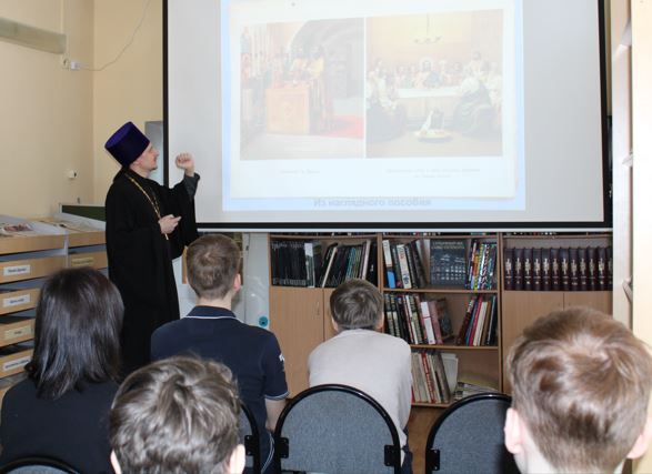 Отец Илья в беседе со школьниками представил их вниманию книгу «Сочинения святого Дмитрия митрополита ростовского», которая была издана в 1842 году. Ребята с интересом рассматривали старинное издание, пытались прочесть древний текст, написанный на старословянском языке.