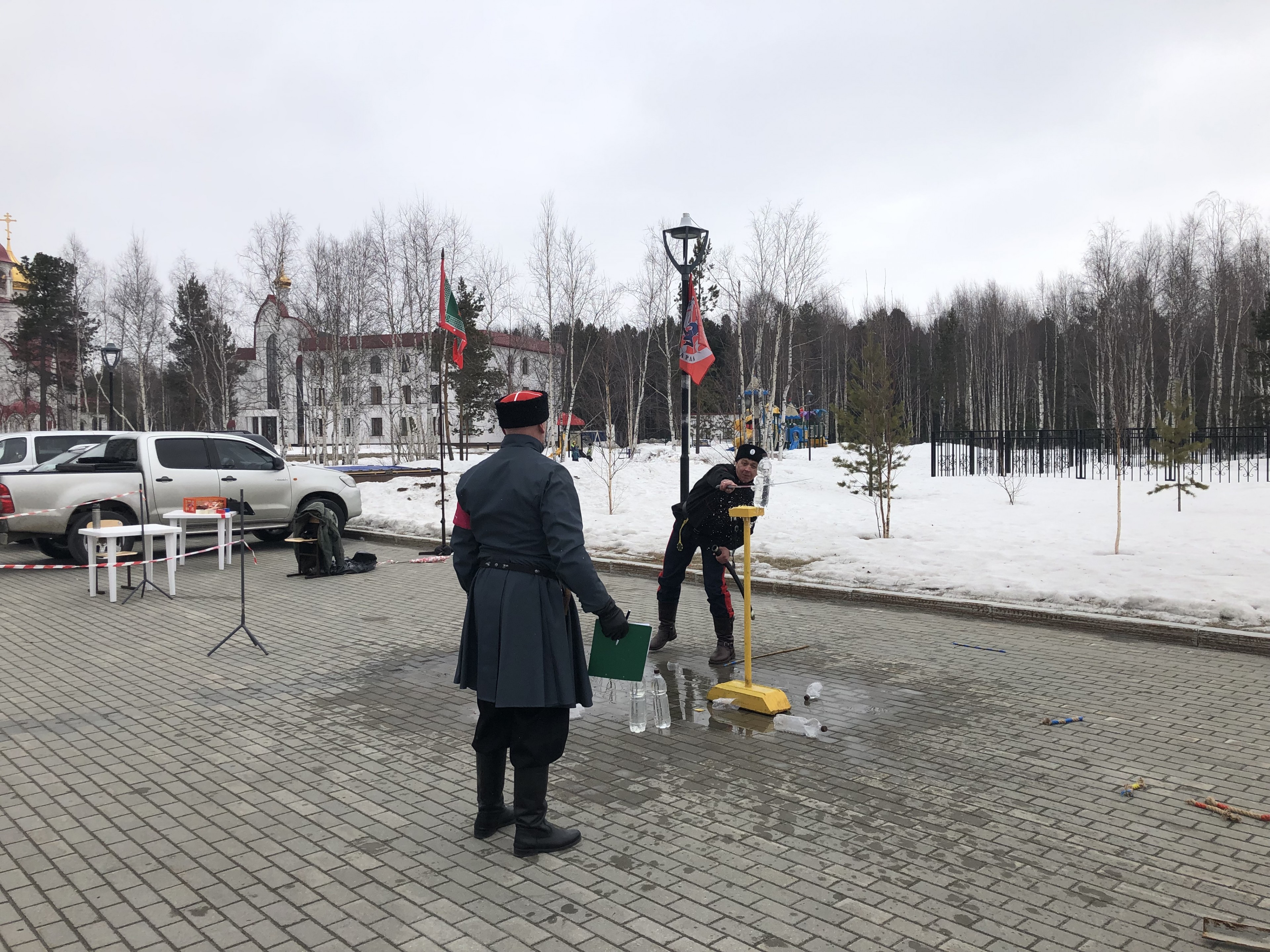 29 апреля 2023 года на территории храмового комплекса в честь великомученика Георгия Победоносца г. Сургута прошли состязания югорских казаков по рубке шашкой «Казарла».
